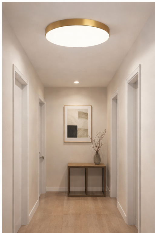 Plafon ATEIA zachwyca smukłą konstrukcją – przy średnicy 40 cm ma zaledwie 6 cm wysokości. Dzięki temu idealnie sprawdzi się w mieszkaniach z niskimi sufitami, korytarzach czy nowoczesnych apartamentach, gdzie liczy się lekkość i harmonia. Złoty kolor dodaje wnętrzu klasy, ale nie dominuje aranżacji – to subtelny akcent, który robi wrażenie.