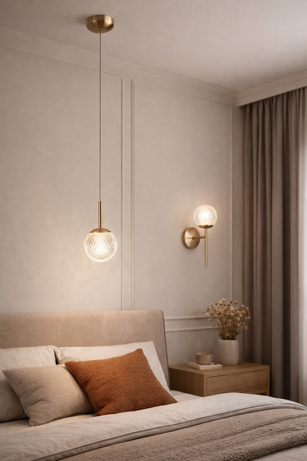 Kinkiet można również zestawić z innymi lampami z kolekcji PADRI – np. lampą wiszącą – tworząc spójną i elegancką aranżację oświetleniową w całym pomieszczeniu.