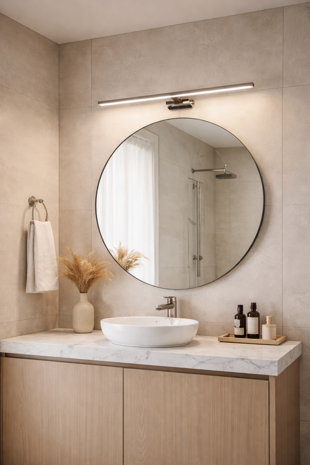Wysokiej jakości metalowa konstrukcja gwarantuje trwałość oraz estetyczny wygląd przez długi czas użytkowania. Chromowane wykończenie podkreśla nowoczesny charakter lampy i łatwo komponuje się z armaturą oraz dodatkami w podobnym stylu. Kompaktowe wymiary (60 × 5 × 10 cm) umożliwiają montaż także w mniejszych pomieszczeniach, bez efektu przytłoczenia wnętrza.