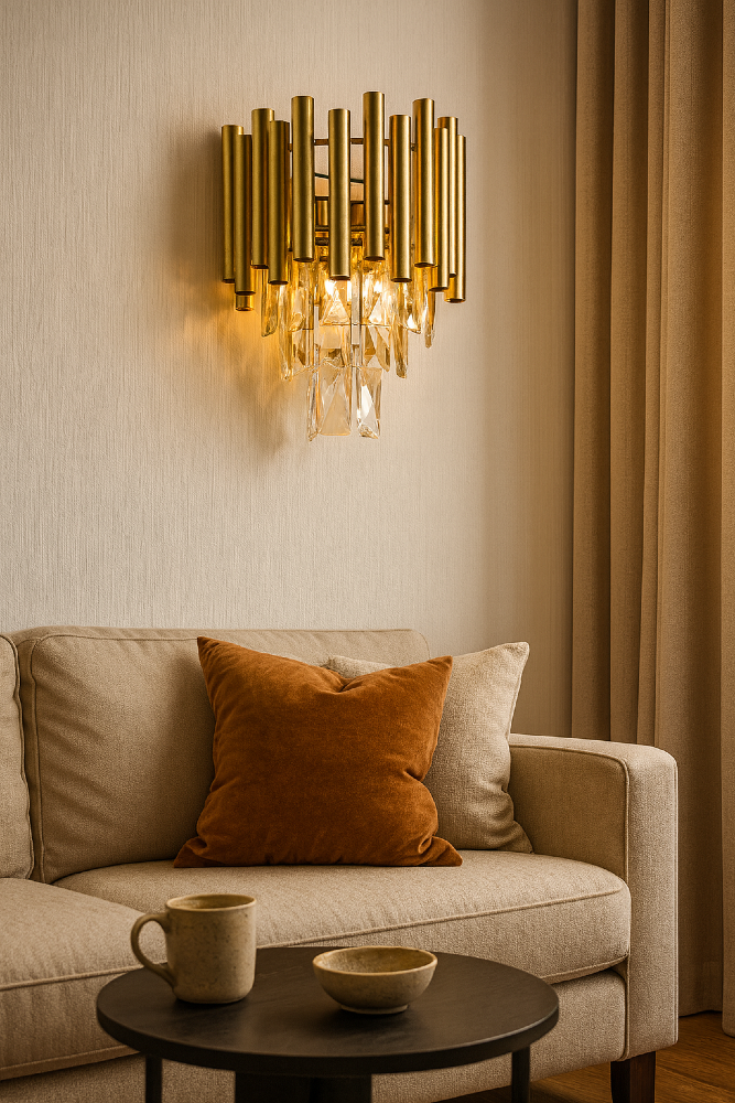 Model BARI zachwyca starannym wykończeniem i efektowną grą światła – kryształy pięknie rozpraszają promienie, tworząc na ścianach subtelne refleksy. Dzięki kompaktowym wymiarom (wysokość 30 cm, szerokość 24 cm, głębokość 16 cm) kinkiet sprawdzi się zarówno jako dekoracyjne oświetlenie boczne w salonie, sypialni, przedpokoju, jak i w eleganckiej jadalni czy nad konsolą.