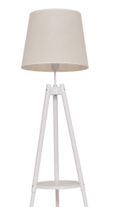 Stabilny trójnóg zapewnia nie tylko wyjątkowy design, ale i trwałość, a praktyczna półka w połowie wysokości czyni lampę jeszcze bardziej funkcjonalną – idealna na książkę, dekorację czy filiżankę kawy. Biały abażur subtelnie rozprasza światło, tworząc przyjemny i przytulny klimat w salonie, sypialni czy biurze.