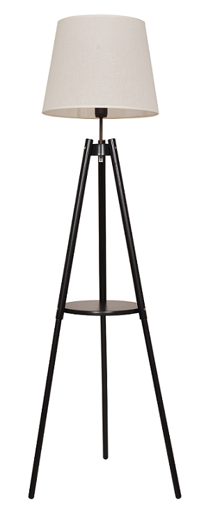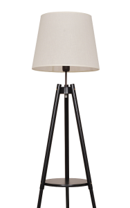 Charakterystyczna konstrukcja na trójnogu z półką w połowie wysokości dodaje lampie wyjątkowego uroku i funkcjonalności – półka może służyć jako miejsce na książkę, filiżankę kawy lub dekoracje. Beżowy abażur subtelnie rozprasza światło, tworząc przyjemny klimat w pomieszczeniu.