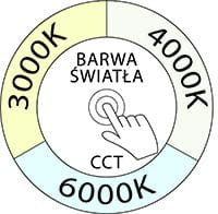 Możliwośc zmiany barwy światła za pomocą przełącznika umieszczonego pod kloszem. Do wyboru barwa 3000 K, 4000 K, 6000 K