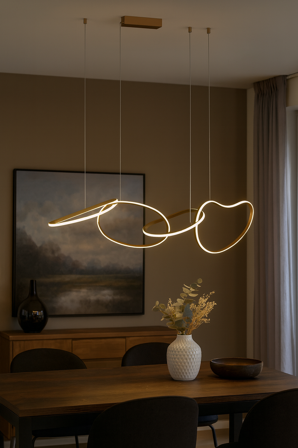 Lampa FONTE to idealne rozwiązanie dla osób, które cenią nowoczesne wzornictwo i funkcjonalne oświetlenie. Świetnie prezentuje się nad stołem w jadalni, w salonie czy przestrzeniach komercyjnych, tworząc efektowny i elegancki punkt centralny wnętrza.