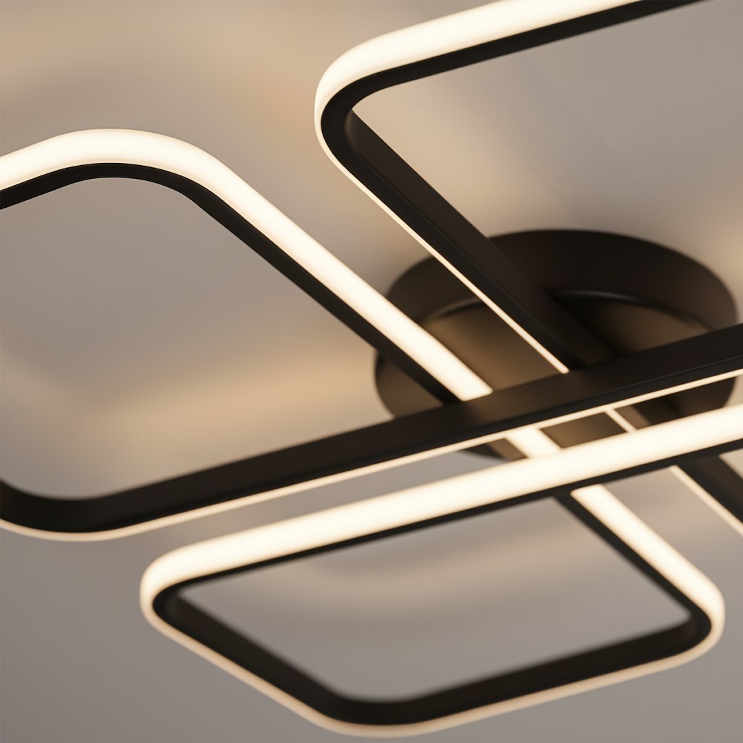 Nowoczesny plafon LED o wymiarach 485 × 485 mm to wyjątkowa propozycja dla osób, które cenią połączenie minimalistycznego designu, funkcjonalności i nowoczesnej technologii. Jego geometryczna forma, oparta na czterech zaokrąglonych ramkach ułożonych w stylową kompozycję, wprowadza do wnętrza lekkość, elegancję i harmonijną symetrię. Czarna kolorystyka dodaje lampie wyrazistości oraz ponadczasowego charakteru, dzięki czemu świetnie komponuje się z aranżacjami modern, loft, scandi, japandi czy glamour.