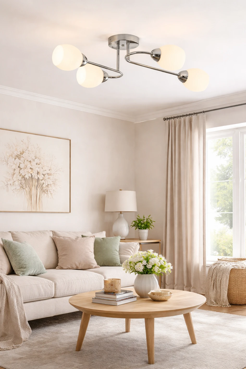 Opalowe klosze ze szkła delikatnie rozpraszają światło, zapewniając równomierne oświetlenie bez efektu olśnienia – idealne do codziennego użytkowania.