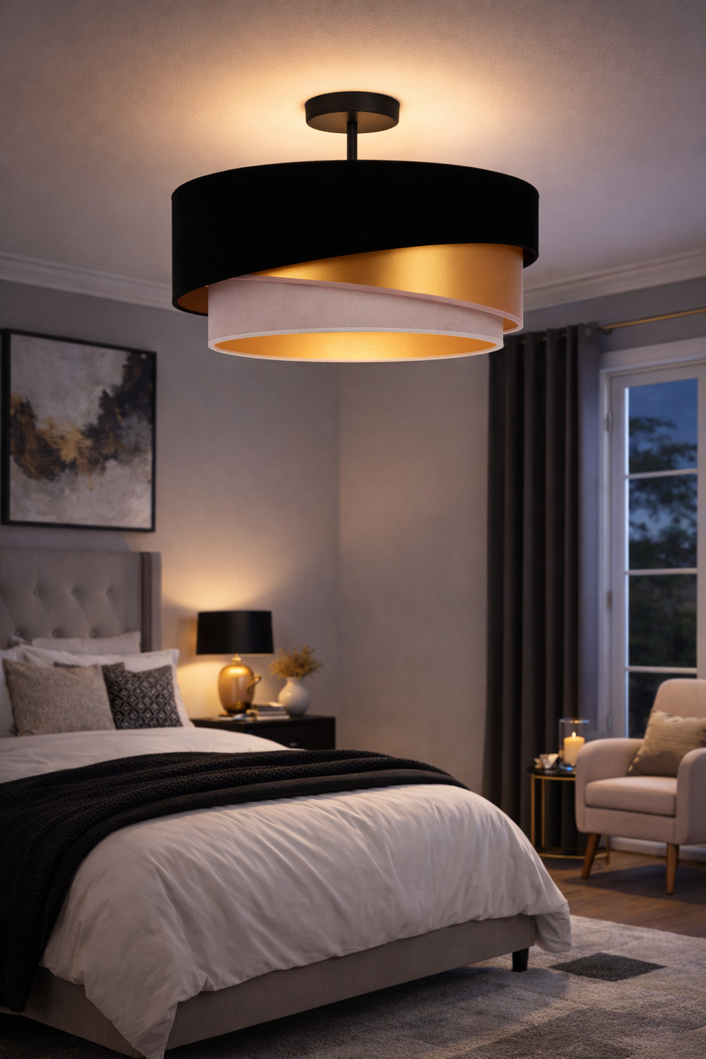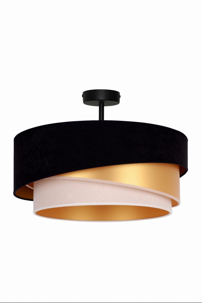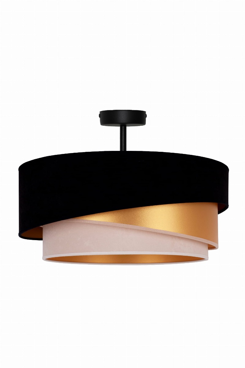 Lampa sufitowa KOBO to doskonały wybór dla osób ceniących stylowe i funkcjonalne oświetlenie. Wykonana z wysokiej jakości metalu oraz zamszowego abażuru w odcieniu czerni, ecru, złotym prezentuje się niezwykle szykownie. Wnętrze klosza pokryte złotą folią subtelnie odbija światło, tworząc ciepłą i przytulną atmosferę.
