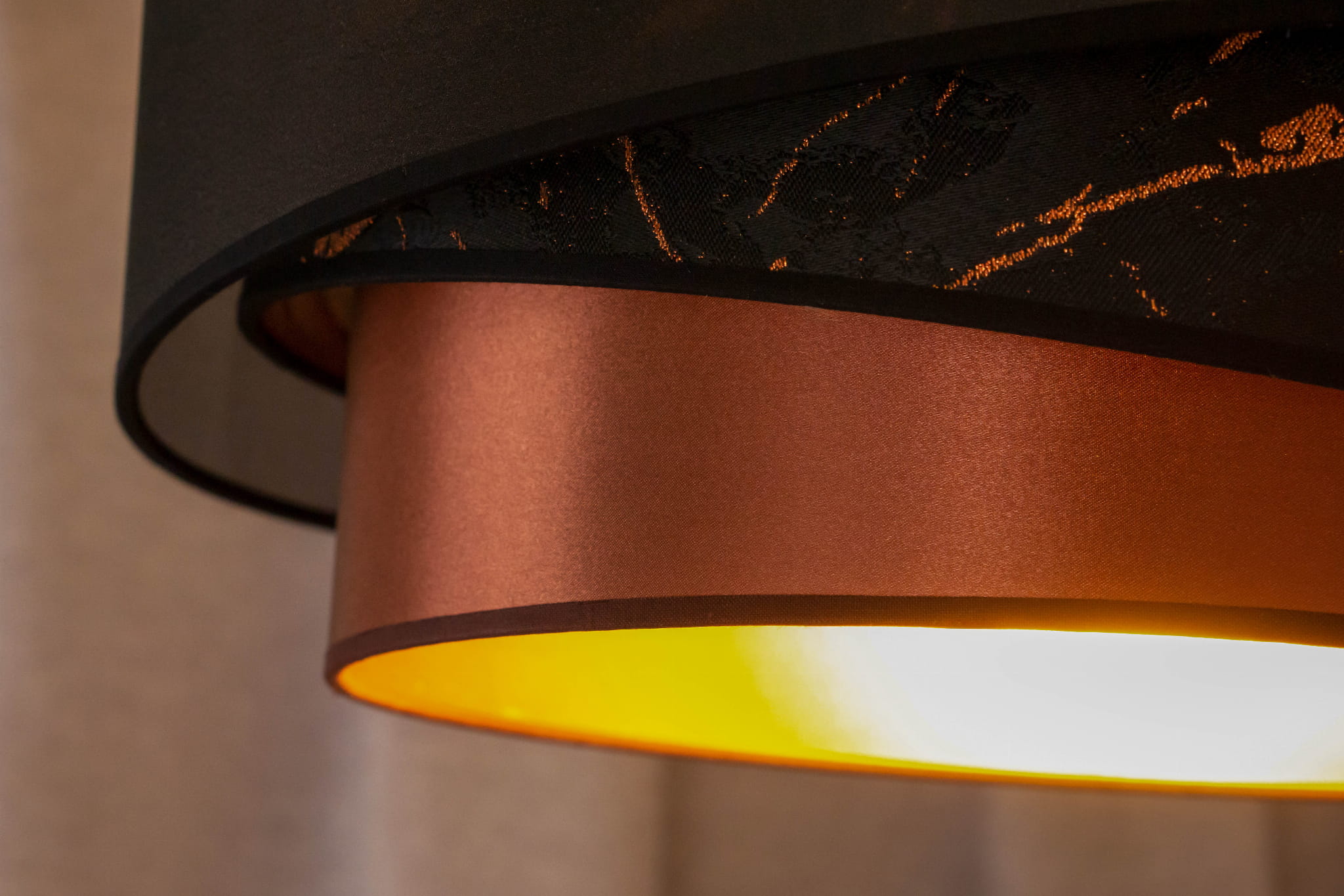 Kolor abażur czarny marmur, czarna organza, miedziany atłas, czarna armatura