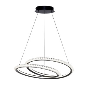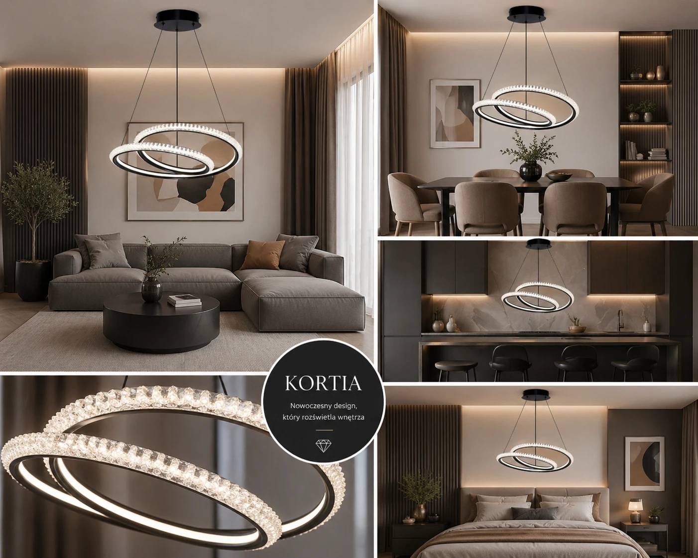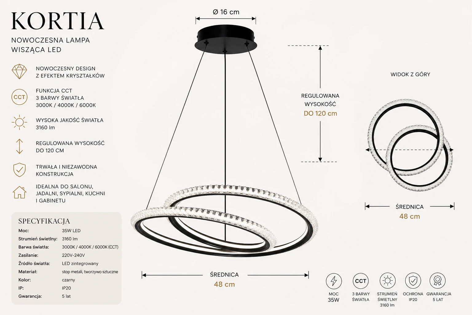 Nowoczesna lampa wisząca KORTIA 35W LED czarna CCT Italux PND-64873-BK to designerskie oświetlenie, które doskonale łączy elegancję z nowoczesnym stylem. Charakterystyczna forma przenikających się ringów w czarnym wykończeniu oraz dekoracyjny efekt kryształków sprawiają, że lampa staje się efektowną ozdobą każdego wnętrza – od salonu po sypialnię.