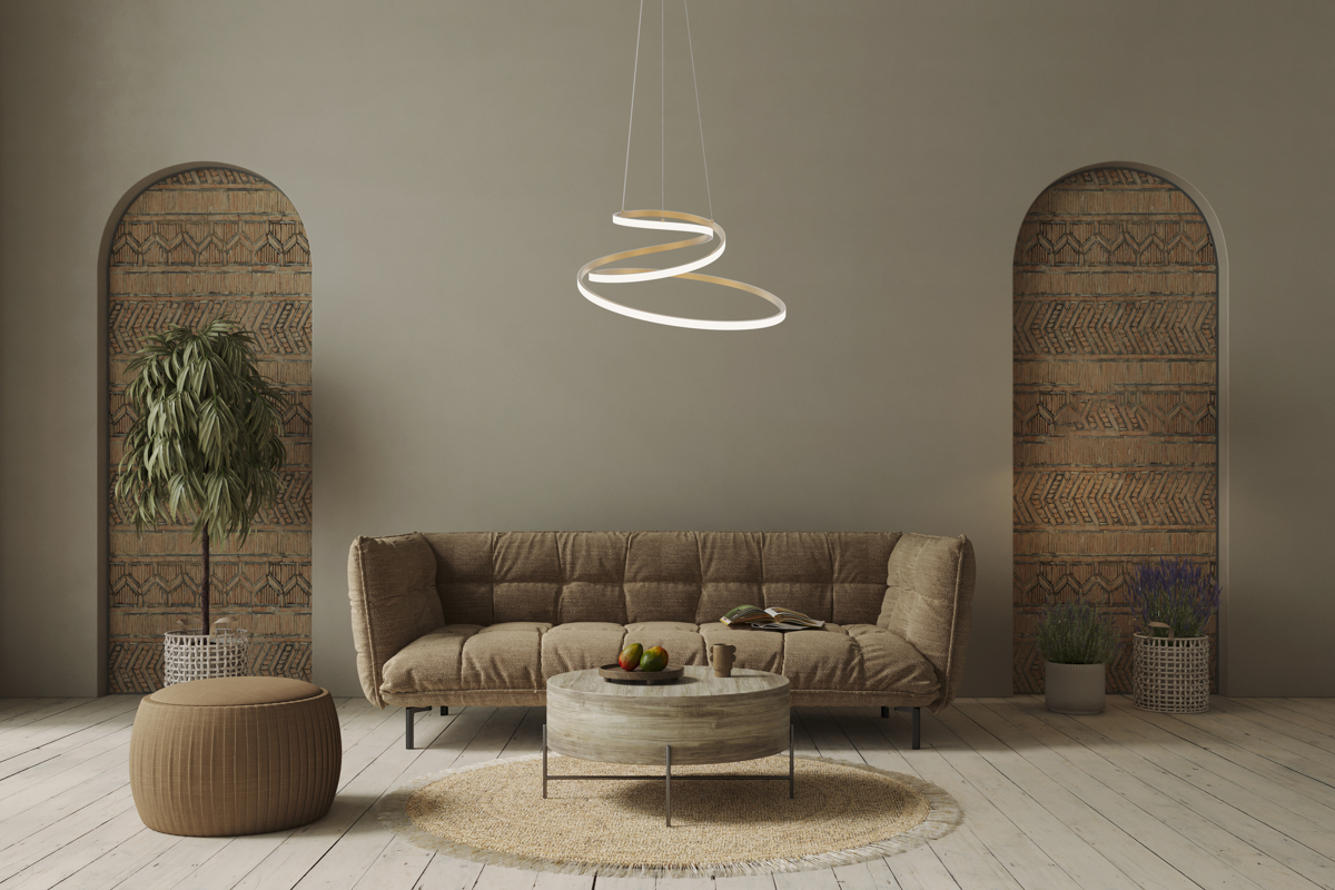 Lampa sufitowa LORILA 60W LED złota wisząca Ring Italux PND-2168-M-GD to nowoczesne i efektowne oświetlenie, które stanie się stylową ozdobą każdego eleganckiego wnętrza. Jej wyjątkowa, spiralna forma w kolorze złotym doskonale podkreśla aranżacje w stylu glamour, modern i minimalistycznym, wprowadzając do pomieszczenia wyrafinowany charakter i luksusowy akcent.
