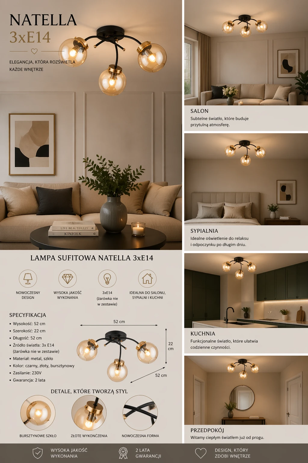 Model o wymiarach wysokość 52 cm, szerokość 22 cm i długość 52 cm doskonale sprawdzi się jako oświetlenie główne w salonie, jadalni, sypialni czy eleganckim przedpokoju. Trzy gniazda E14 pozwalają na montaż żarówek o mocy do 40 W (również LED), co zapewnia ekonomiczne i efektywne światło.