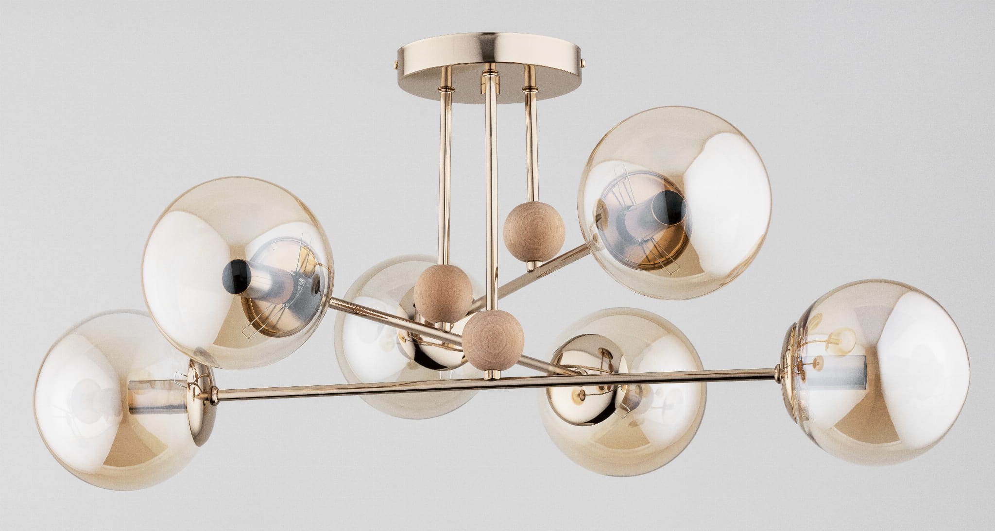 Jej kolor złoty nadaje jej wyjątkowego blasku i wspaniałego efektu wizualnego. Klosze w formie kul, wykonane z bursztynowego szkła, dodają lampie niepowtarzalnego uroku i tworzą ciepłe, przyjemne światło.
