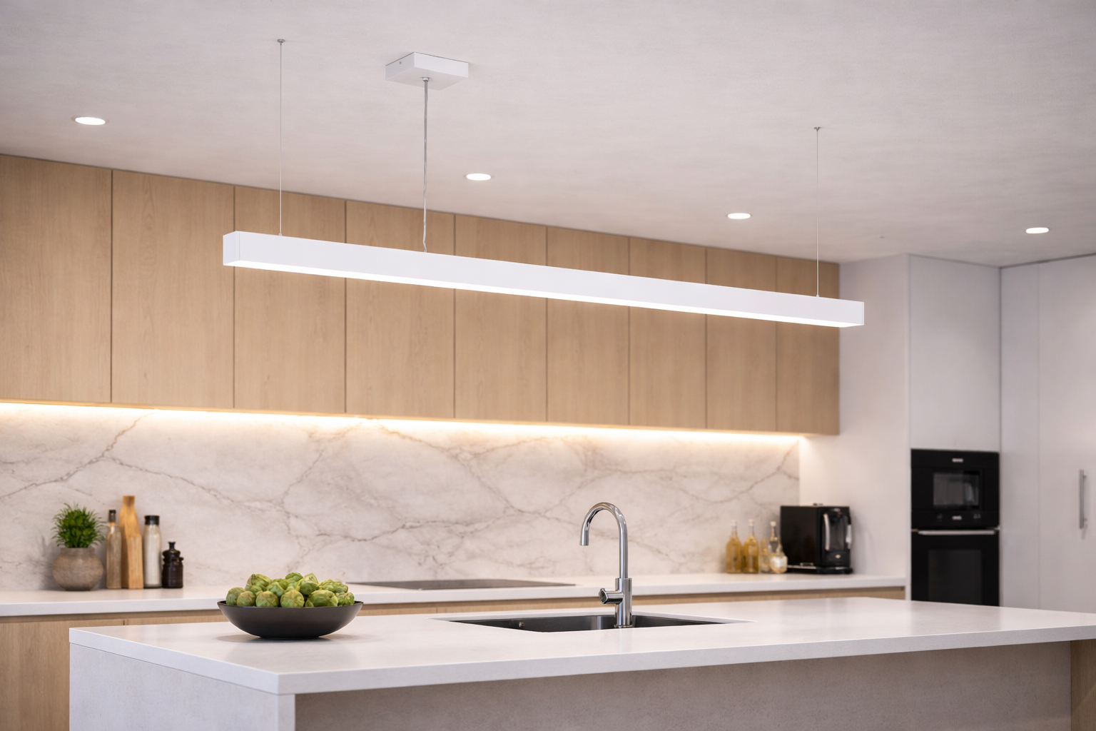 Nowoczesna lampa liniowa wisząca LED o długości 142 cm to profesjonalne rozwiązanie oświetleniowe przeznaczone do biur, przestrzeni komercyjnych oraz magazynowych. Minimalistyczna forma w kolorze białego matu doskonale wpisuje się w nowoczesne i techniczne aranżacje wnętrz, zapewniając jednocześnie wysoką funkcjonalność i komfort pracy.