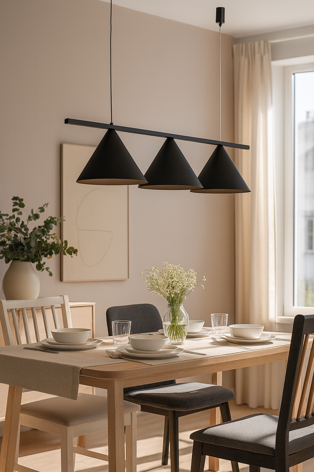 Lampa wisząca CAPITAL 3xGX53 Milagro MLP0938 to elegancka i nowoczesna oprawa oświetleniowa, która doskonale podkreśli charakter jadalni, kuchni czy przestrzeni komercyjnych. Wykonana z trwałego metalu w kolorze głębokiej czerni, zachwyca minimalistyczną formą i potrójną listwą z trzema stożkowymi kloszami o średnicy 30 cm każdy. Regulowana wysokość w zakresie 40–90 cm pozwala dopasować lampę do wielkości pomieszczenia i wysokości stołu lub wyspy kuchennej.
