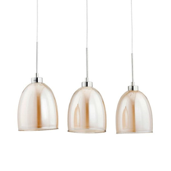 Wyróżnia się eleganckim wykończeniem w kolorze chromu i szampańskim, a także kloszami o podwójnej konstrukcji – zewnętrzne szkło w odcieniu bursztynowym pięknie współgra z wewnętrznymi białymi kloszami, tworząc przytulną, ciepłą atmosferę.