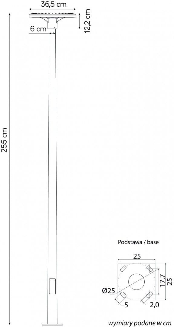 W kolorze grafitowym RAL 7016, latarnia STER prezentuje się stylowo i elegancko, pasując do różnorodnych otoczeń. Z wysokością 255 cm i średnicą 36,5 cm stanowi imponujący element krajobrazu, który nie tylko oświetla, ale także nadaje charakteru Twojej przestrzeni.