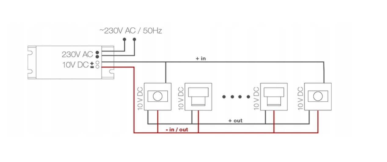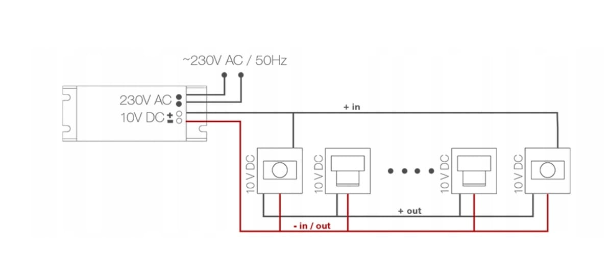Łączna moc zastosowanych opraw ML nie może przekraczać mocy znamionowej transformatora zasilającego.