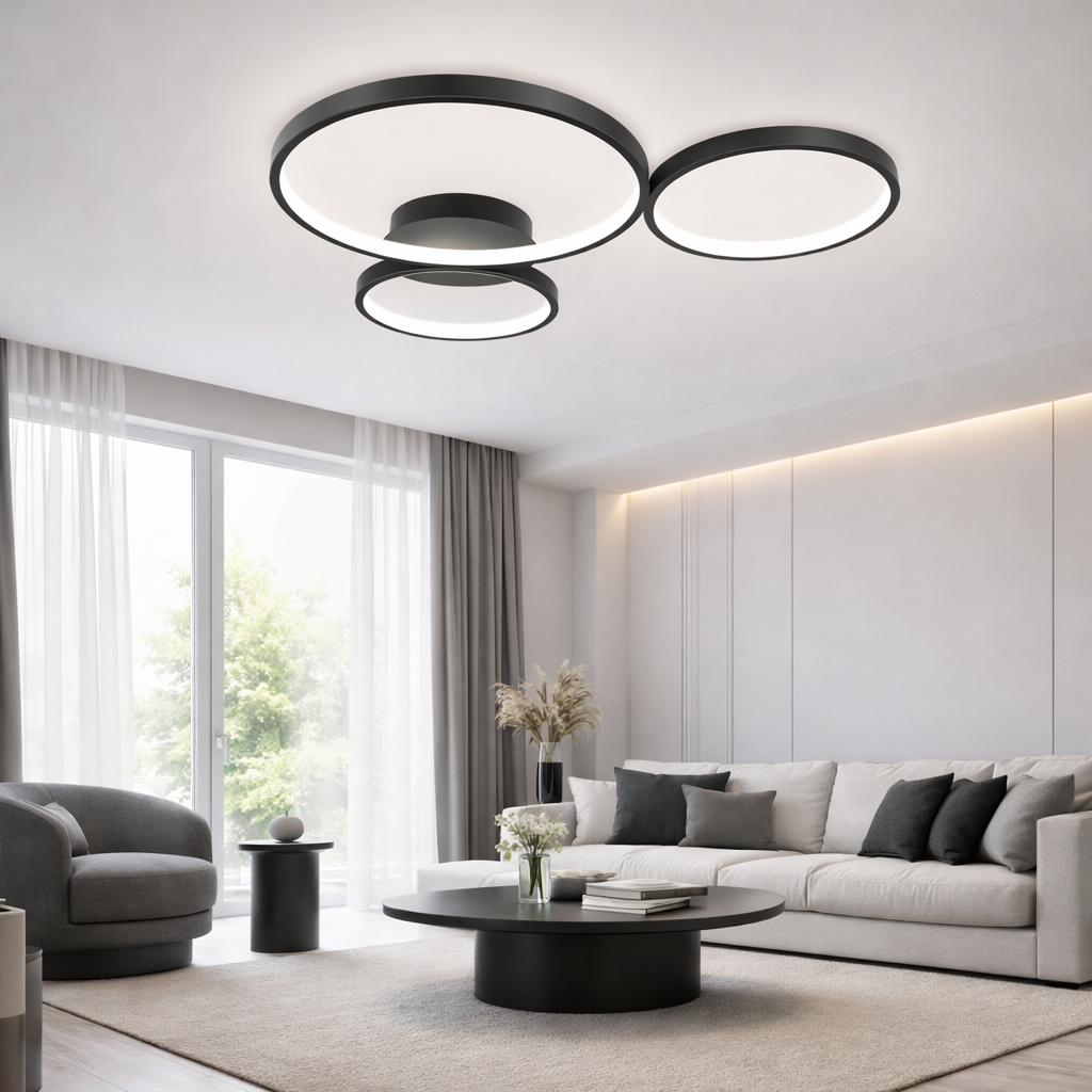 Plafon MAVER Ringi 3 to designerskie oświetlenie sufitowe, które wyróżnia się nowoczesną formą i wyjątkowym efektem wizualnym. Trzy świetlne pierścienie osadzone w eleganckiej, czarnej ramie tworzą harmonijną kompozycję, która doda charakteru każdemu wnętrzu – od salonu po nowoczesne biuro.