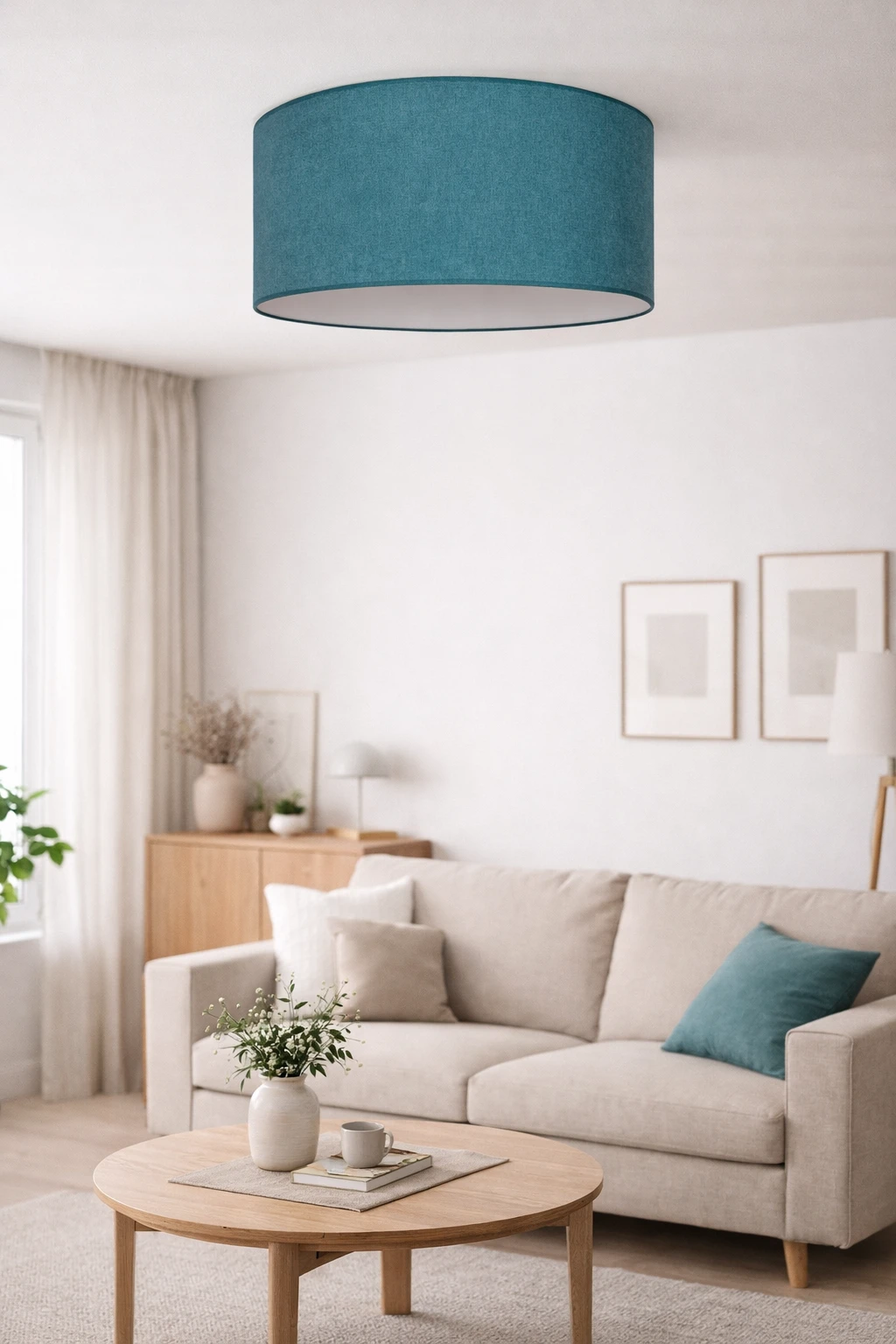 Turkusowy kolor abażura w zestawieniu z białym wnętrzem klosza tworzy harmonijną całość, która rozjaśnia wnętrze i nadaje mu świeżości. Plafon doskonale sprawdzi się jako główne oświetlenie w salonie, sypialni, jadalni, pokoju dziennym czy gabinecie, a także w przestrzeniach komercyjnych – hotelach, apartamentach i biurach.