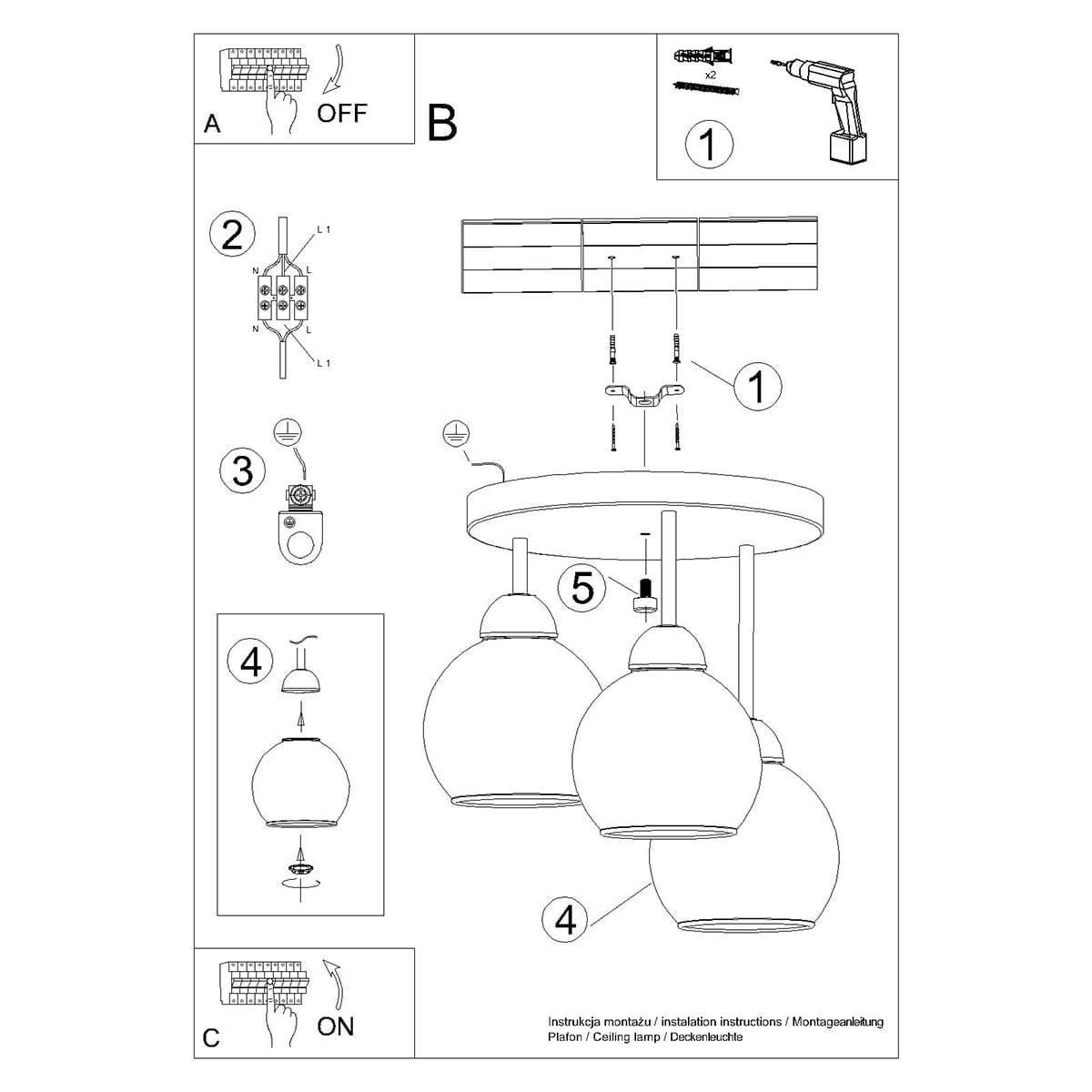 Źródło światła: E27, 3x60W, 3x15W LED, 50-60Hz, ~220-230V, IP20, klasa ochronności I