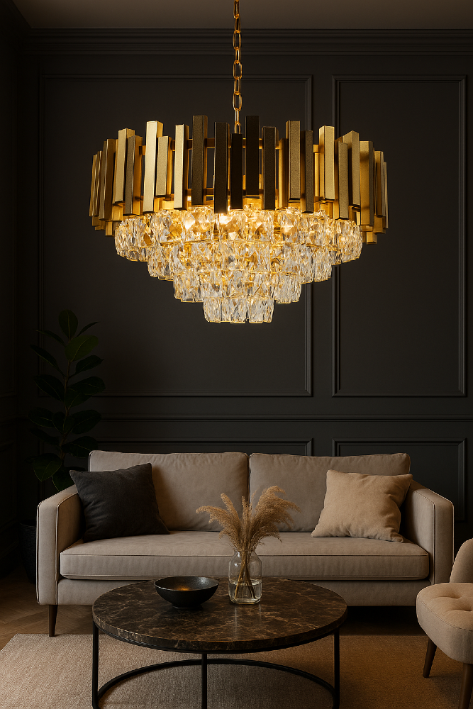 Żyrandol VALETTA 5xE27 to idealny wybór do wnętrz w stylu glamour, klasycznym, nowojorskim czy modern luxury. Połączenie złotego wykończenia z połyskującymi kryształami nadaje pomieszczeniom luksusowy klimat, podkreśla elegancję mebli i dodatków oraz tworzy niezwykłą, przytulną atmosferę pełną światła i blasku.